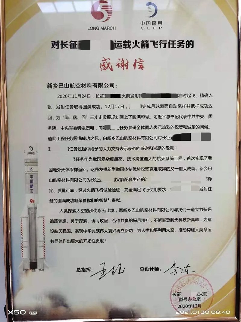近日,新鄉(xiāng)巴山航空材料有限公司收到運載火箭型號辦公室發(fā)來的感謝信,信中對我公司為某運載火箭飛行任務做出的貢獻表達了感謝。